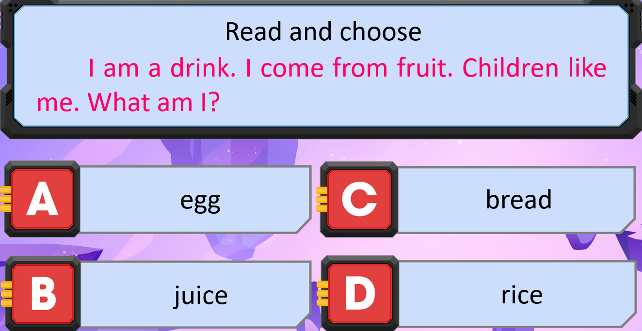 Giải thích: I am a drink. I come from fruit. Children like me. What am I?: Tôi là đồ uống. Tôi đến từ hoa quả. Trẻ nhỏ rất thích tôi. Tôi là gì?
